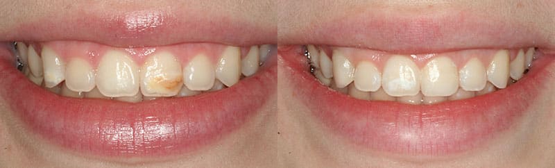 This patient presented to the office after a traumatic incident left her front teeth fractured. In less than one hour, Dr. Palmieri was able to rebuild the teeth to their natural contours and esthetics with composite bonding.